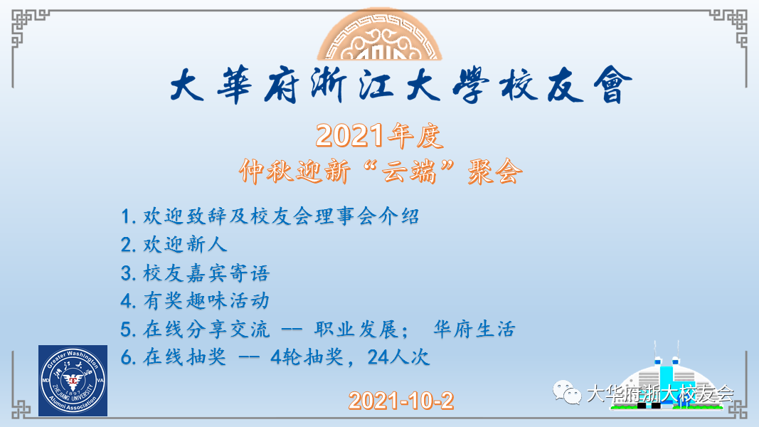 (康路夷、刘运韬、赵君 /华盛顿 报道) 2021年10月2日晚上7点,大华府浙江大学校友会一年一度的“仲秋迎新聚会”在Zoom线上平台如约而至。刘运韬和吴哲校友主持聚会,各位新老校友、朋友趁此良辰佳节,在浓浓的浙大情怀中开怀畅谈,展望美好前路。有60余位来自马里兰、弗吉尼亚和华盛顿特区的校友在Zoom会议室线上参与聚会,30余名校友通过YouTube直播平台同步观看。